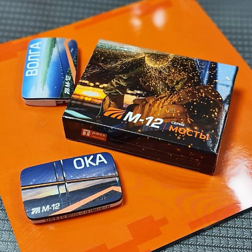 Транспондер T-pass эксклюзивной серии «Мосты» посвящен открытию автодороги М-12. Транспондер T-pass используется для оплаты проезда по платным дорогам. Он позволяет проезжать пункты взимания платы без остановки и с экономией до 15% за счет участия в Программе лояльности. Устройство не требует подзарядки и устанавливается на лобовое стекло автомобиля.